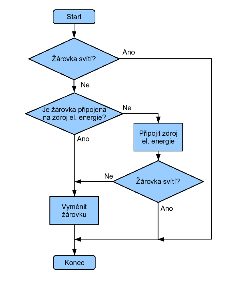 - grafické vyjádření požadovaného algoritmu (znázornění jednotlivých příkazů (kroků), ze kterých se algoritmus skládá