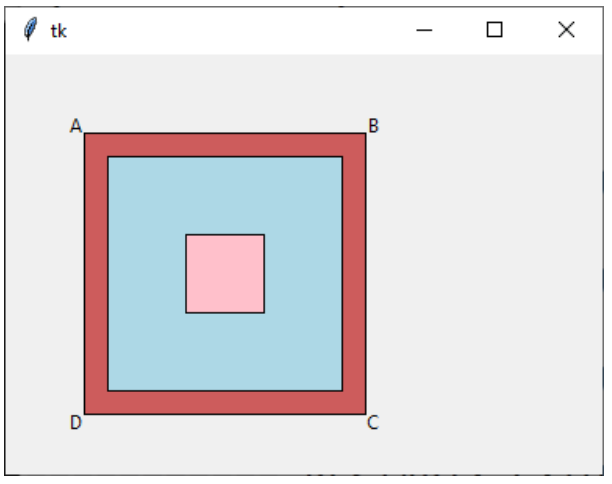 Napiš program, který nejprve nakreslí dva čtverce - první bude mít levý horní vrchol v (x, y) a velikost hrany a1, druhý má stejný střed ale velikost a2 (a2 < a1). Potom postupně: