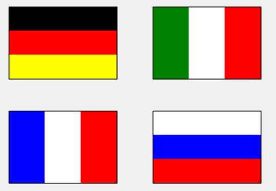- Napiš program, který nakreslí vlajky těchto států: Německo, Itálie Francie a Rusko:
