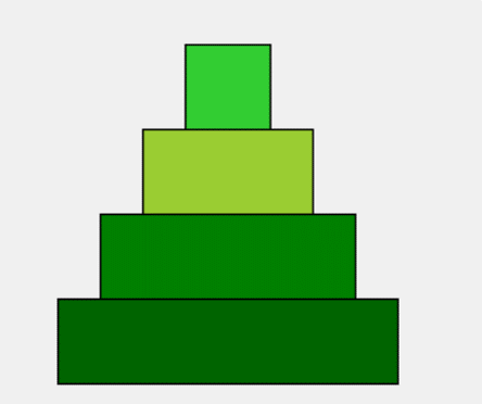 Napiš program, který nakreslí pyramidu z obdélníků velikosti 200×50, 150×50, 100×50 a 50×50. Největší z nich má střed dolní hrahy (180, 250). Všechny obarvi čtyřmi odstíny zelené barvy. Na vykreslení použij jeden for-cyklus, ve kterém bude proměnná barva nabývat čtyř různých řetězců (jména barev) a v cyklu se budou měnit proměnné y a momentální šířka obdélníka: