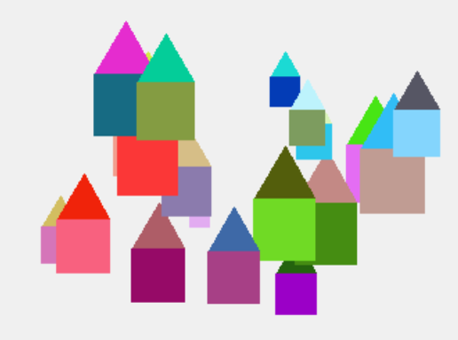 Napište program, který nakreslí n náhodných barevných domečků. Každý domeček se skládá z rovnostranného trojúhelníka (viz předchozí úkol) a čtverce. Polohu domečku, velikost strany čtverce a trojúhelníka a barvy zvol náhodně.