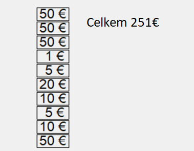 Napište program, který vygeneruje n bankovek s náhodnými hodnotami (pod sebe). Na genrování použij: hodnota = random.choice((1, 2, 5, 10, 20, 50) -náhodně vybere jedno číslo ze zadané posloupnosti. Program na závěr spočítá výslednou sumu.