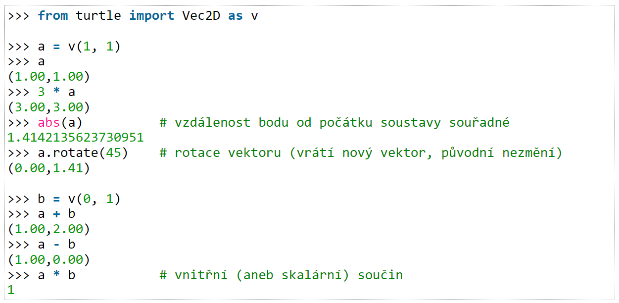 Želva podporuje zadávání (a vracení) souřadnic kromě klasické dvojce hodnot (x, y) také jako objekt typu Vec2D. Jako potomek n-tice se chová jako n-tice, ale jeho velkým přínosem je přímá podpora vektorových operací, konkrétně: